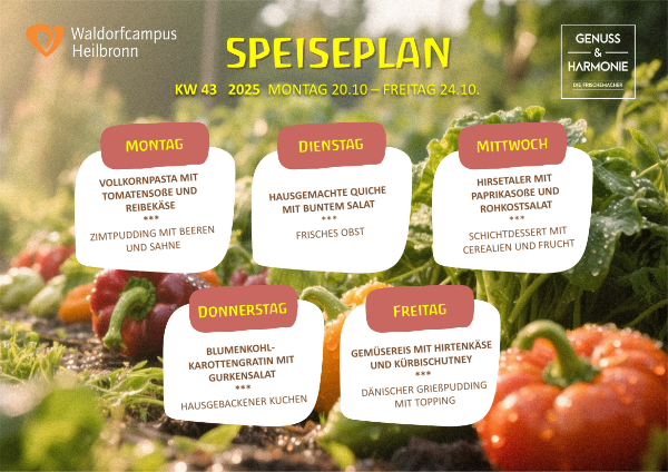 Ab dem kommenden Schuljahr übernimmt „Genuss & Harmonie“ die Verpflegung für Schule, Kindergarten und Kita. Der Fokus liegt auf einer individuellen Frischeküche, saisonalen und regionalen Zutaten, echter Handwerkskunst und dem Verzicht auf Geschmacksverstärker und Zusatzstoffen. Wir haben gemeinsam mit Genuss & Harmonie ein maßgeschneidertes Konzept für unseren Campus entwickelt, das den Anforderungen der anthroposophischen Ernährungslehre gerecht wird.